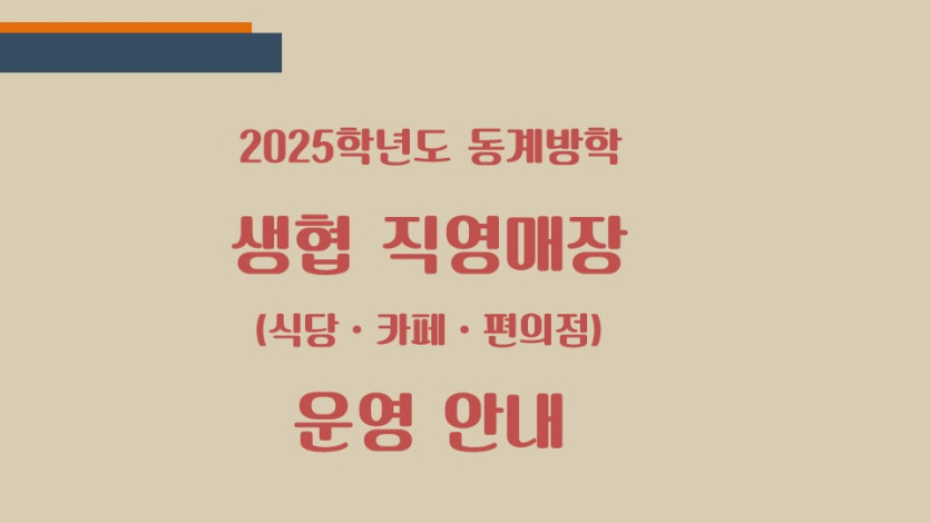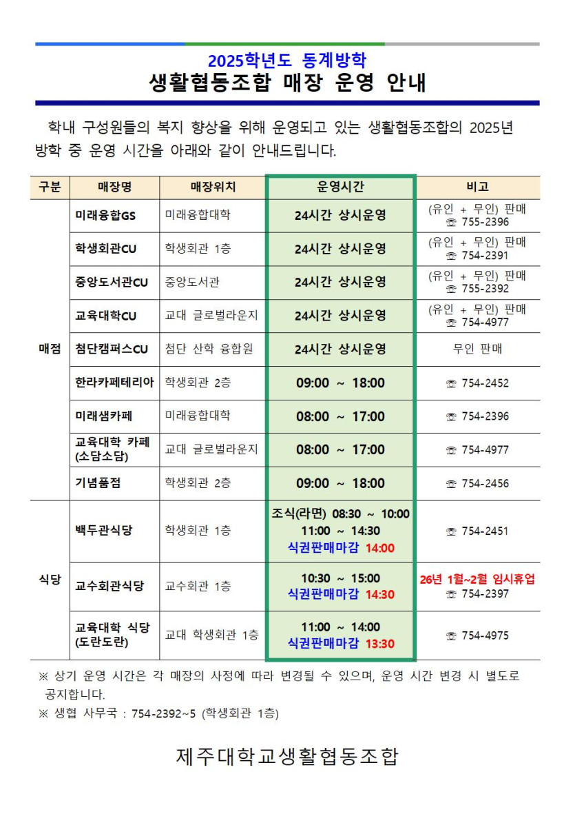 생협 직영매장 25년 동계방학 운영 안내 페이지 정보 작성자관리자 댓글 0건 조회 96회 작성일 25-12-22 15:33 본문 생협 직영매장 25년 동계방학 운영 안내 목록 다음글생협 식당(백두관ㆍ교수회관ㆍ도란도란식당) 만족도 조사 25.10.27