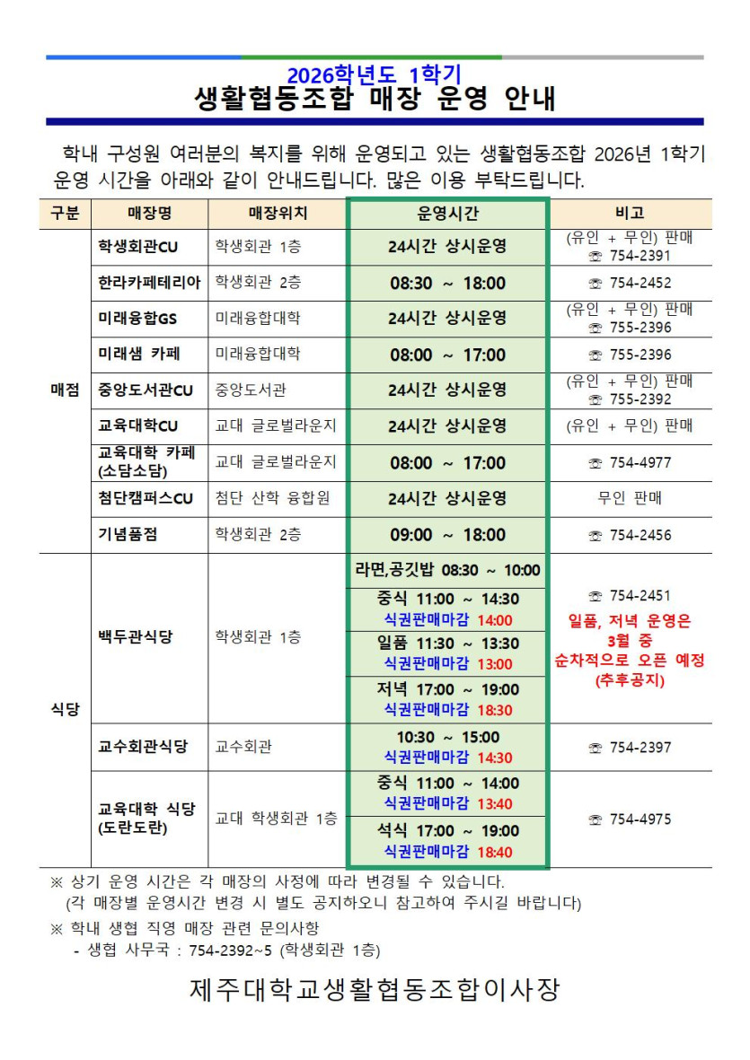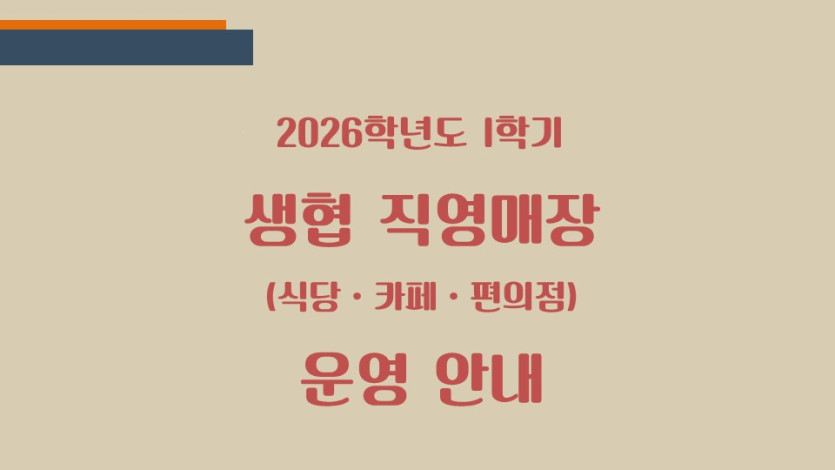 생협 직영매장 2026년 1학기 운영 안내 페이지 정보 작성자관리자 댓글 0건 조회 5회 작성일 26-02-26 17:07 본문 생협 직영매장 2026년 1학기 운영 안내 목록 다음글생협 직영매장 25년 동계방학 운영 안내 25.12.22
