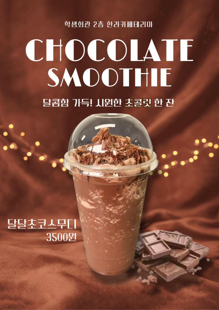 한라카페테리아 새로운 메뉴 <달달초코스무디> 페이지 정보 작성자관리자 댓글 0건 조회 433회 작성일 25-06-11 14:30 본문 한라카페테리아 새로운 메뉴 <달달초코스무디>고오급 빠삐* 시험기간 텐션 끌어올려!!! 목록 이전글25학년도 하계방학 백두관식당ㆍ교수회관식당 운영 변경 안내 25.06.13 다음글교수회관식당 비빔국수 개시 25.05.15